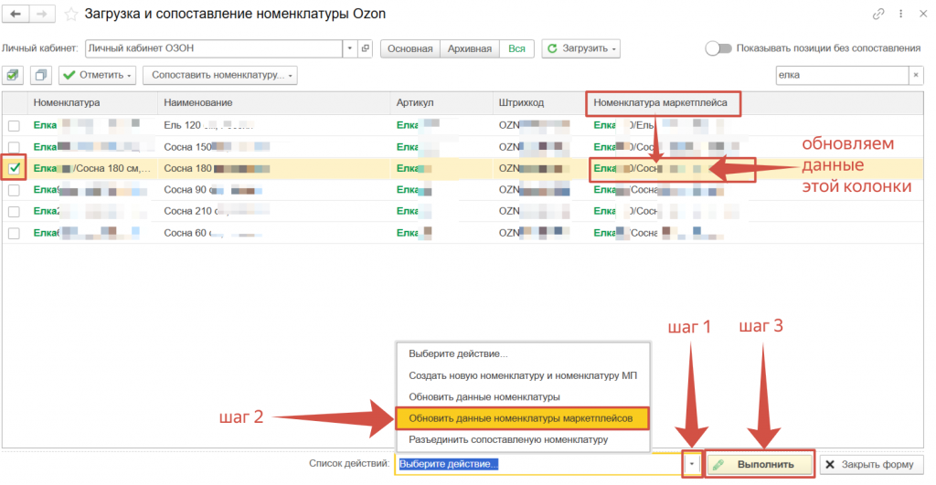 Далее выбираем из списка действий значение “Обновить данные номенклатуры маркетплейсов” >> и нажимаем кнопку “Выполнить”.