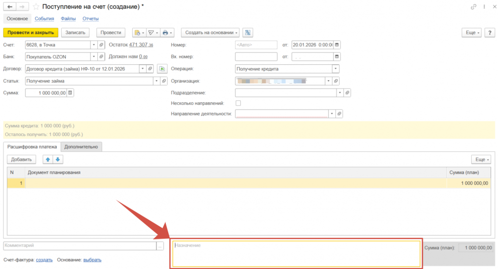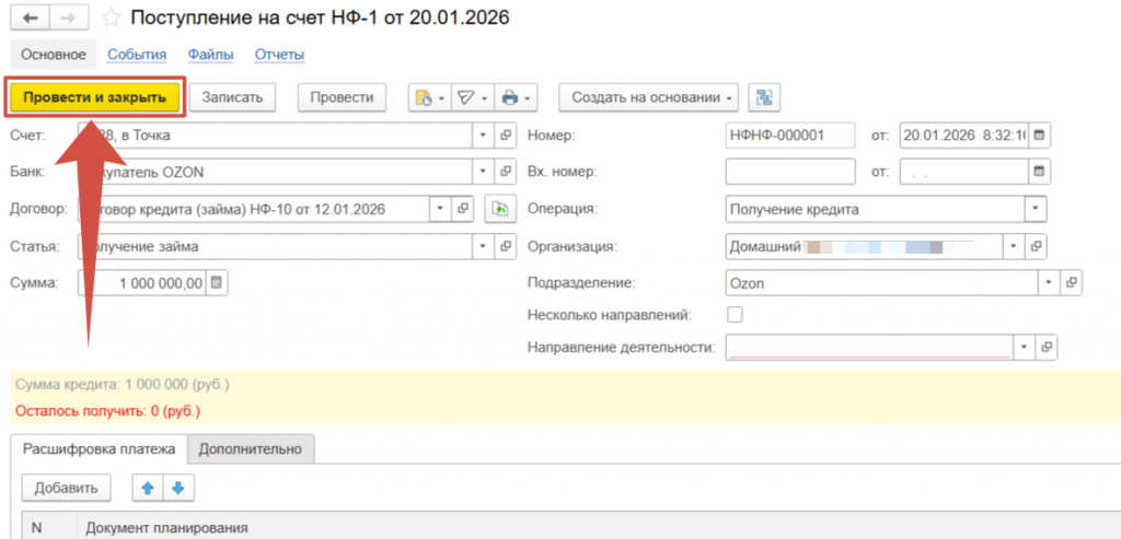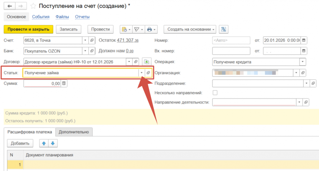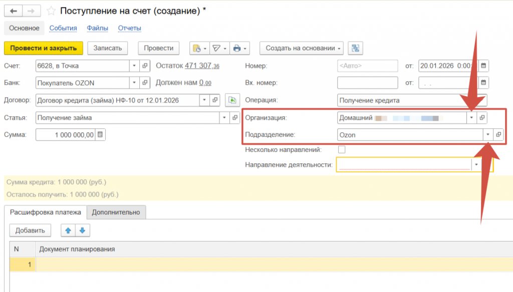 При необходимости выбираем Организацию, Подразделение и Направление деятельности.