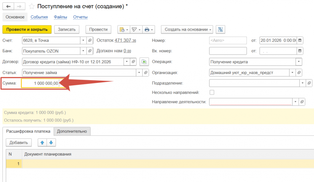 Указываем сумму, например, нам поступило 50 тыс. руб.;