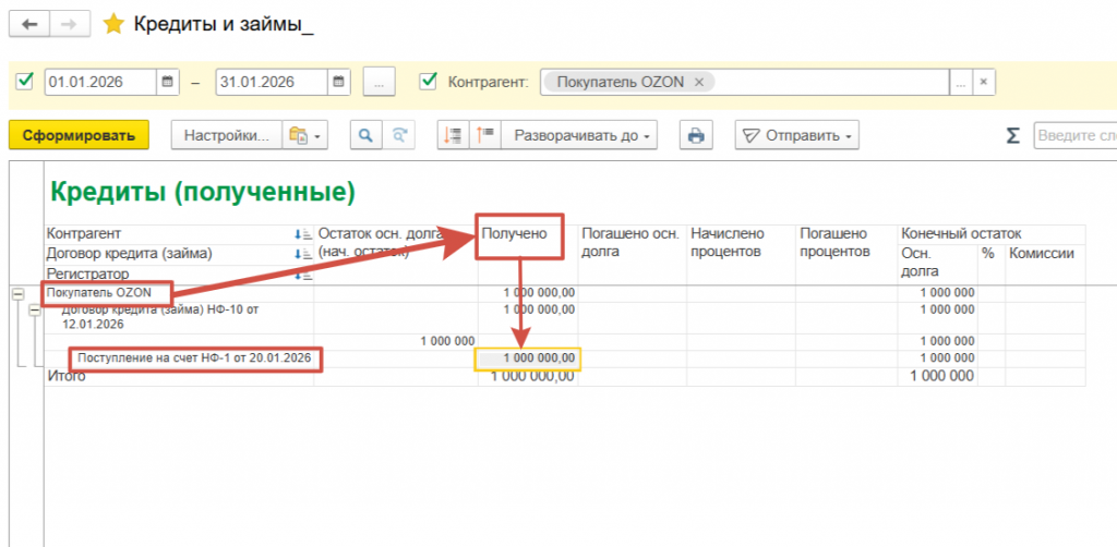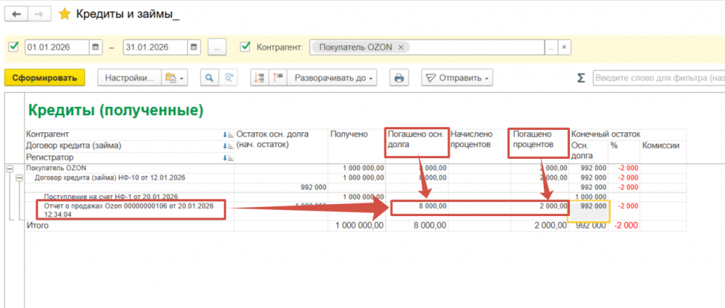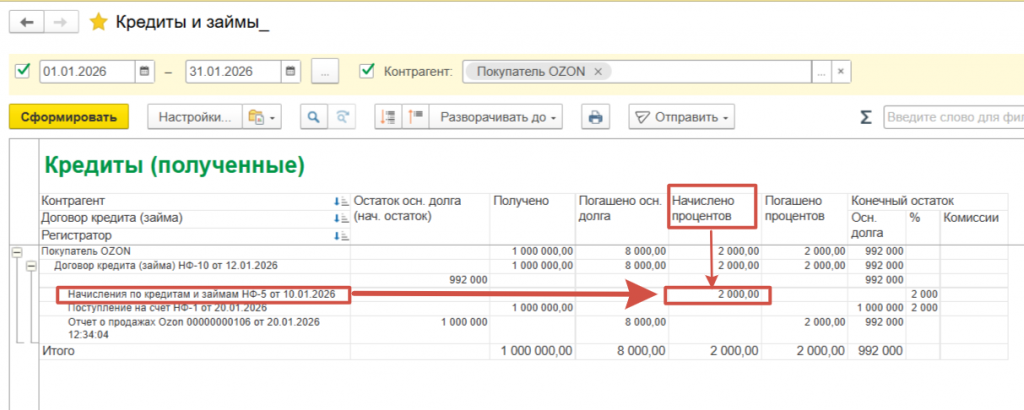 Данный заем можно увидеть в избранном отчете «Расчеты по прочим операциям».