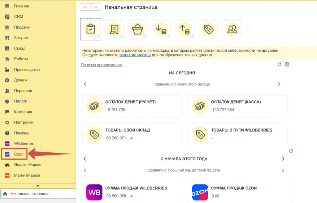Для каждой компании и ИП, то есть подразделения, мы рекомендуем создавать отдельного контрагента Ozon и Wildberries, и привязывать его в Личный кабинет 1С для синхронизаций.
